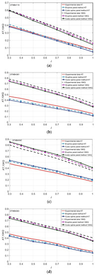Control polygon and control points of the B-spline interpolation were inversely calculated by the basis function for fitting and smoothing 3-D hydrofoil and propeller discreted panels integrated with a low-order panel method for efficient and effective hydrodynamic prediction improved in this study. The hydrodynamic performance of the 3-D hydrofoil, sweepback hydrofoil, and dihedral hydrofoil with different aspect ratios was analyzed to verify the rationality and feasibility of the method. Finally, the results of pressure distribution and the coefficients of thrust and torque for different 3-D screw propellers were obtained and compared with the experimental data. The comparison results were found to be satisfactory. National Advisory Committee for Aeronautics (NACA) airfoils [33,34,35] and David Taylor Model Basin (DTMB) propellers [2,36,37,38] have been extensively adopted for the validation of the numerical schemes thanks to the availability of the experimental data for several different foil profiles and propeller models.
