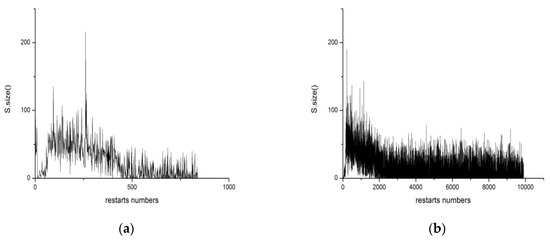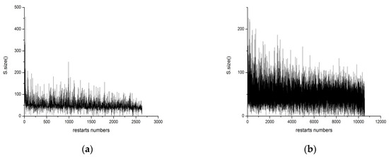 From Figure 2, it is evident that plenty of S.size() = 0 exists. Apparently, S.size() is equal to zero, which shows that the assignment trail did not contain a repeated variable and searched from a diverse path, hence it reveals that changing the order of the variables has a role in choosing a different path, and further illustrates the effectiveness of this algorithm. Additionally, from Figure 1b, we can see that the value of S.size() is approximately between 20 and 80. Meanwhile, after utilizing the proposed method, it is shown that the value of S.size() is between 0 and 20. This kind of phenomenon, on the one hand, means that the reduction of the value of S.size() implies that the number of duplicate assignment trails is decreasing. On the other hand, it further indicates that the proposed strategy is workable, due to the fact that it dynamically tunes decision variables and hence explores different branches.