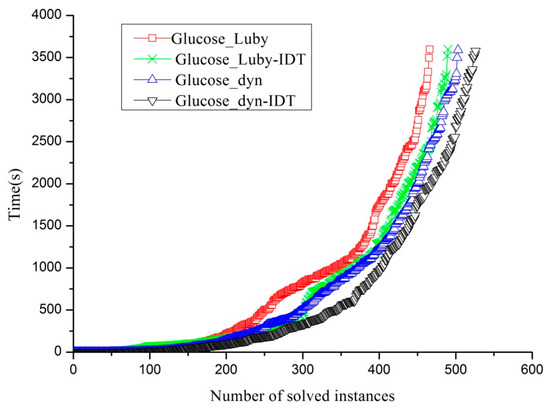 As can be seen from the cactus plot in Figure 3, the cactus of Glucose_dyn-IDT (Glucose_Luby-IDT) is always to the right and below the curve of Glucose_dyn(Glucose_Luby), respectively. Additionally, the cactus of Glucose_dyn-IDT is on the far right and at the bottom. It states that the Glucose_dyn-IDT solver has the best solving performance. From Figure 4a, for the SAT instances, the performance of the Glucose_dyn-IDT solver is the best, and the solution performance of the Glucose_Luby solver and the Glucose_Luby-IDT solver is similar; from Figure 4b, for the UNSAT instances, the performance of the four solvers varies greatly, and the Glucose_dyn solver performs the best.