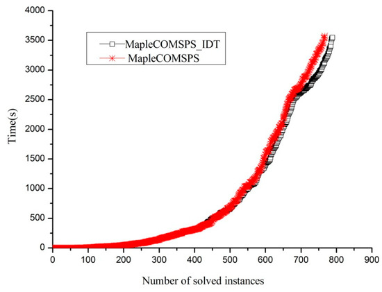 From Table 6, the total number of solved instances by MapleCOMSPS_IDT increases by 1.7% compared with the MapleCOMSPS solver. The cactus plot comparing the performances of the two solvers can be observed in Figure 5. Although the amount of growth is small, the overall solution performance is improved slightly by the modified MapleCOMSPS_IDT solver.
