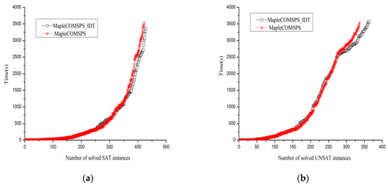 Figure 6 shows the performance comparison of the MapleCOMSPS vis-a-vis the MapleCOMSPS_IDT over the SAT instances and UNSAT instances, respectively. It can be seen clearly that our proposed strategy has a better performance for the SAT instances and UNSAT instances.