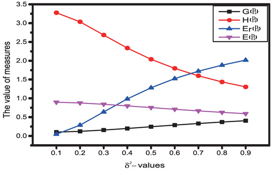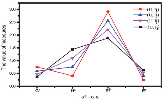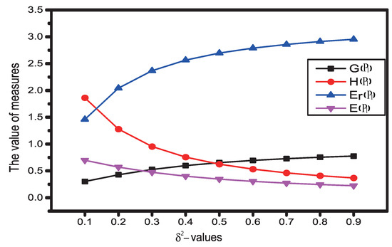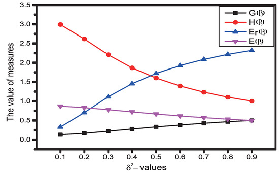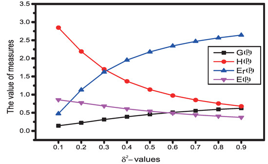 - If , consider δ-information granulation and δ-rough entropy, is got. That shows the larger the subsystem, the smaller the measured value. Pay attention to δ-information amount and δ-information entropy, we have That displays the measured value of the subsystem is larger than the smaller one (see Figure 5).
