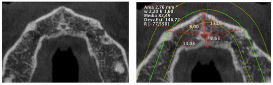 This is a cross-sectional and observational clinical study for which we selected a sample of 153 patients consecutively from the University dental clinic of Murcia (Spain). The study was approved by the Bioethics Committee of the University of Murcia. All individuals gave their informed consent in writing before participating. The following inclusion criteria were applied; patients in health conditions both systemic and dental, not pregnant, images that do not contain artefacts. A total amount of 130 patients that met all the criteria described above (five were discarded because they were submitted to treatments with bisphosphonates as well as 18 other subjects, since their images presented artefacts or were not considered with enough quality to be able to apply our fractal dimension procedure). All CBCTs were performed using the same Planmeca® equipment, Planmeca ProMax 3D Max (Planmeca Oy, Helsinki, Finland) calibrated according to technical considerations. X-rays were obtained with the patient in the same position (prone position). The beam emission parameters were kV , mA , exposure time of 12 s ( s) with an image size of voxels (each voxel being equivalent to 200 m). The evaluation software used was the Romexis 2.5.1® program (Planmeca Oy, Helsinki, Finland), which allowed observing the image in a multiple window where the axial, coronal and sagittal planes can be visualized in mm intervals, in addition to a 3D vision. As indicated above, the sample was divided into three groups. We proceed to select a specific ROI that was obtained in the axial plane at the height of the nasal spine, visualising the nasopalatine foramen and the canine mamelons on both sides, see Figure 1.