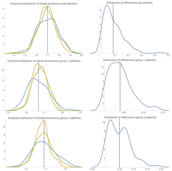 The blue line in each plot at the left illustrates the empirical distribution of the fractal dimension values for all the binary images analyzed from each group in our patient sample. Further, the discontinuous line marks the mean fractal dimension of the binary images from all the scanners analyzed. Notice also that the orange line (resp., the green line) represents the empirical distribution of the fractal dimensions of the left side (resp., the right side) binary images from each group of patients. On the other hand, each graph at the right depicts the empirical distribution of the differences (in absolute value) between each left side binary image and its corresponding right side one from each group of patients. The discontinuous line represents the mean of such differences.