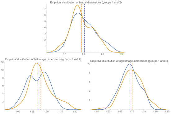 The means of the fractal dimensions of the right side binary images from each group were compared, as well. Figure 4 (second row, right) illustrates the empirical distributions of the fractal dimensions of the right binary images in each group.