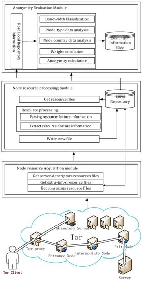 The design of the MFBS is based on the operational data of the Tor, and the network information between the entrance node and the exit node of Tor needs to be processed. According to the functional requirements of the system, the functional modules of the MFBS can be divided into the following: the node resource acquisition module, the node resource processing module, and the anonymity evaluation module. The overall architecture of the design is shown in Figure 1.