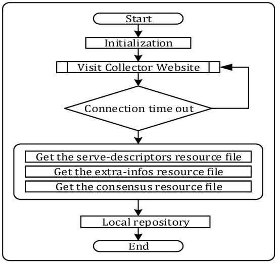 The main execution flow of the node resource acquisition modules is shown in Figure 2. The module is a preliminary collection of Tor network data. In the design of the module, the actual operating data of the node in the Tor network was obtained from the official website of CollecTor, a service provided by the Tor network that regularly collects data services from Tor relay nodes, bridge agents, etc. The entire Tor network information can be provided after aggregation, and it will guarantee the objectivity of this module.