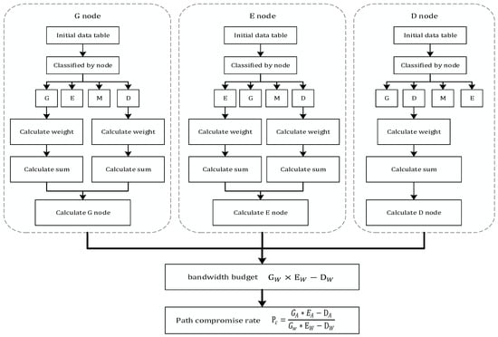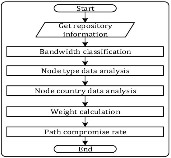 The main execution flow of the anonymity evaluation module is shown in Figure 4. In actual anonymous networks, the bandwidth distribution of the node type and the node IP address will have an impact on the anonymity. Some scholars have analyzed the statistical results of node data in anonymous networks through qualitative analysis, indicating that the distribution of node countries will affect the anonymity of anonymous networks; however, the subjective judgment factors here are large. Therefore, the MFBS scheme based on bandwidth strategy is proposed in this section. Considering the influence of geographical distribution in an anonymous network, we can quantitatively analyze the node specifically and objectively influence the bandwidth distribution of anonymous networks by adding the constraints of node distribution. According to the bandwidth distribution of each node type corresponding to the country type, we can more comprehensively evaluate the anonymity of the anonymous network in which the attacker gets different bandwidth budgets. According to the specific distribution of current network node data, the purpose of this module is to statistically analyze the bandwidth budget of different node types and design the corresponding weight calculation scheme using the objective weighting algorithm. We can calculate the path compromise rate in attack mode so that the global anonymity can be evaluated.