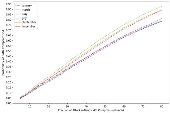 In this paper, all odd month data sets from January to November were selected. The anonymity assessment result of the attacker under different bandwidth budgets is shown in Figure 6. The abscissa indicates the bandwidth budget ratio that the attacker can control, and the ordinate indicates the percentage corresponding to the path compromise rate.