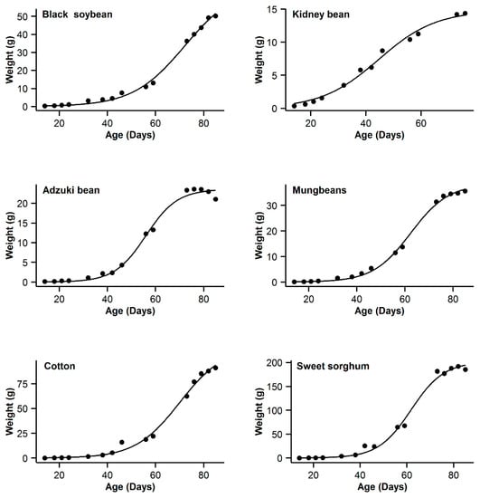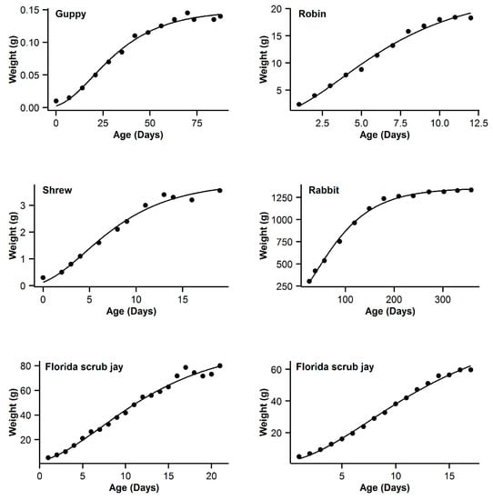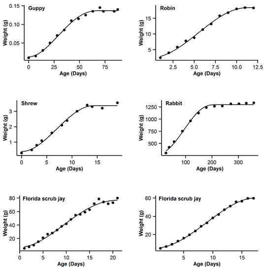 We tested these models using growth datasets of 12 species, including datasets of six plant species: black soybean, kidney bean, adzuki bean, mung bean, cotton, and sweet sorghum [] and six animal species: datasets of guppy, robin, shrew, and rabbit [] and datasets of Florida scrub jay [] and Western scrub jay [].