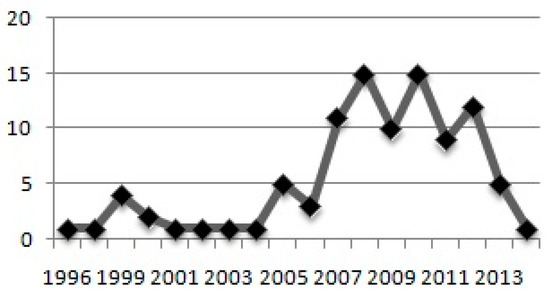 Figure 3 shows the distribution of DeP studies from the year 1995 to 2018. It shows that the research in DeP picked up in the year 2005 when five studies were conducted. Out of the total 98 studies selected for this mapping, only 12 were conducted till 2004. In 2007, 2008, 2009, 2010, 2011, 2012 and 2013 the number of DeP studies conducted is 11, 15, 10, 15,9, 12, and 5 respectively. These account for 77 out of the selected 98 studies. For 2018, we could find only one quality publication till date, but the data for 2018 should not be considered complete. One of the reasons for the surge in DeP studies after 2005 could be the availability of the public domain data on the PROMISE repository.