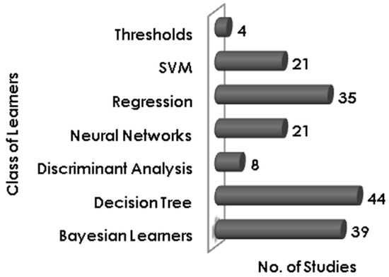 In this section, we elaborate on the distribution of model building techniques used in DeP studies. As shown in Figure 4 the most used learning method is the Decision Tree, 44 out of 98 studies selected for this systematic mapping use some variant of the decision tree method. Techniques like C4.5, J48, CART, and Random Forest come under the decision tree class. Bayesian learners [65] i.e., Naïve Bayes, Bayes Net, etc. have been used by 39 studies. Regression, Discriminant analysis and Threshold based classification have been performed in 35, 8 and 4 studies respectively. Both support vector machine and neural network have been used in 21 studies.