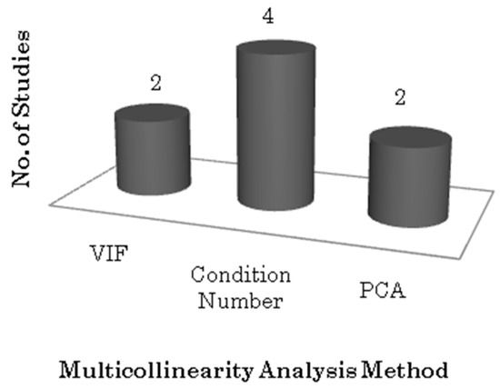 Figure 5 shows the graphical representation of the distribution of multi-co-linearity analysis techniques used across seven studies. We can see that the Condition Number method is the most popular in DeP studies, four studies make use of this method. VIF (variable inflation factor) and PCA (principal component analysis) were applied in two studies each.
