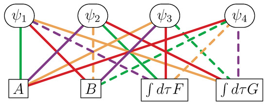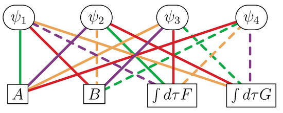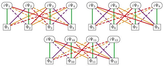 and given by Equation (9) and satisfy the algebra in Equation (10). By the rules explained in Section 2, it can be seen that the 0-brane transformation laws for the VM, Equation (6), with and matrices as in Equations (28) and (9) and nodal field definitions (Equation (27)), are described the adinkra in Figure 5. The VM is in the trans-equivalence class () as can be seen through either Equation (11) or through field redefinitions transforming Figure 5 into the trans-adinkra in Figure 2.