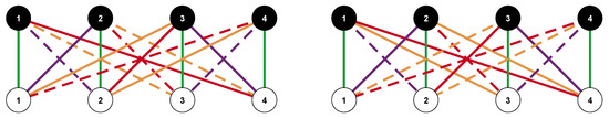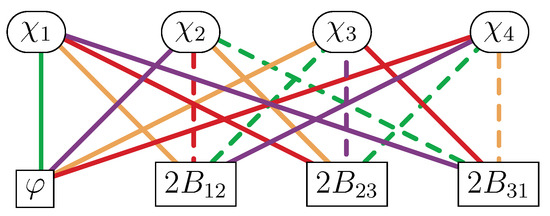 and given by Equation (9) and satisfy the algebra Equation (10). By the rules explained in Section 2, it can be seen that the 0-brane transformation laws for the CM, Equation (6), with and matrices as in Equations (18) and (9) and nodal field definitions (Equation (17)), are entirely described by the adinkra in Figure 3, which is the same image as Figure 1 in the Introduction. The CM is in the cis-equivalence class as can be seen in the following two ways