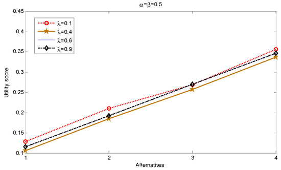 Note: For the convenience of observation, the curves for λ = 0.1 and λ = 0.4 are shifted up and down by 0.01 units, respectively, and the curves for λ = 0.6 and λ = 0.9 are coincident; x-axis represents the alternatives under consideration.