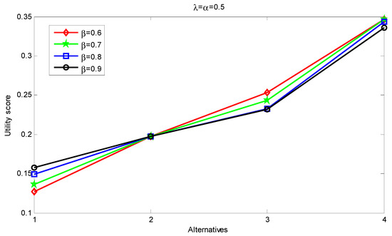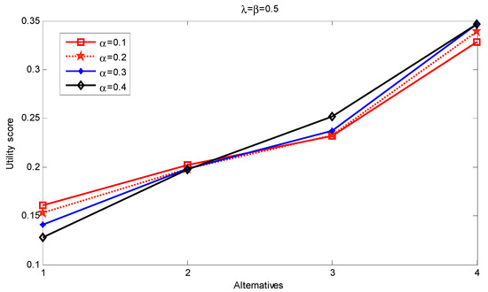 First, we fix the values of the parameter and allow to vary, i.e., . The ranking is repeated for several values of and the results are summarized in Table 7. As one can note, the resulting ranking order is stable based on NWTIFBHM with fixed (α, β). Figure 1 presents the results graphically and depicts the resulting ranking indicators for each alternative under different parameter values. As it can be seen from Figure 1, as , given the changes of (within interval defined by ), the stability of the ranking remains rather high.