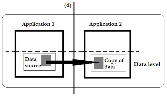 Various approaches reference application integration (AI) topics [1,2,3]. Relevant for our demarche is the following consideration regarding AI, which is defined as a process of “keeping redundant copies of data (in independently designed applications) consistent, or enabling end-users to access data and functionality from independently designed applications on a single user interface” [9]. In Figure 1, two independently designed applications are involved in an integration process. Data are retrieved from Application 1 and stored in Application 2 in a corresponding format. Making an analogy with a symmetry model using (d) as its symmetry axis, the “copy of data” object is symmetric to the “data source” object.
