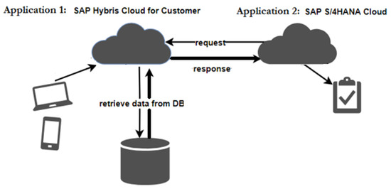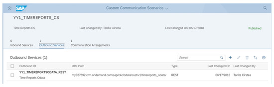 A communication system was created in S/4 HANA [14,16] to integrate SAP Hybris Cloud for Customer and S/4 HANA Cloud, a process for “keeping copies of data (in independently designed applications) consistent”, as mentioned at the beginning of Section 3. In the communication scenario, the OData service URL was specified, as seen in Figure 4. Further integration aspects, e.g., authentication methods, were established by the communication arrangement [16].