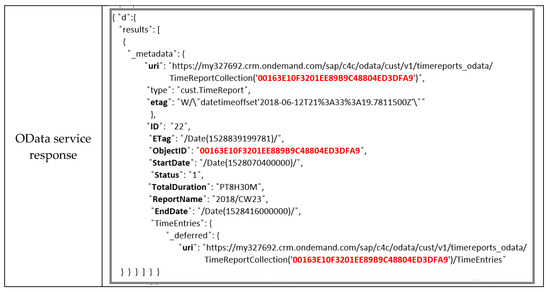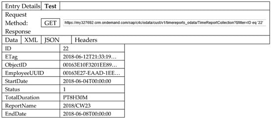 A time report from the C4C system is transferred and stored in the S/4 system. A Time Report BO is a collection of time entries, which can be defined for a date or a date range. Employees can record time for different activities/tasks in which they are involved, e.g., work, travel, administration, vacation [14,15]. An employee can also have many time reports. Time recording enables managers to keep track of which employees are doing day-to-day work, which in turn helps to improve productivity and customer satisfaction, reduce cost, and enable employees to be more productive by making it easier for them to record their time.