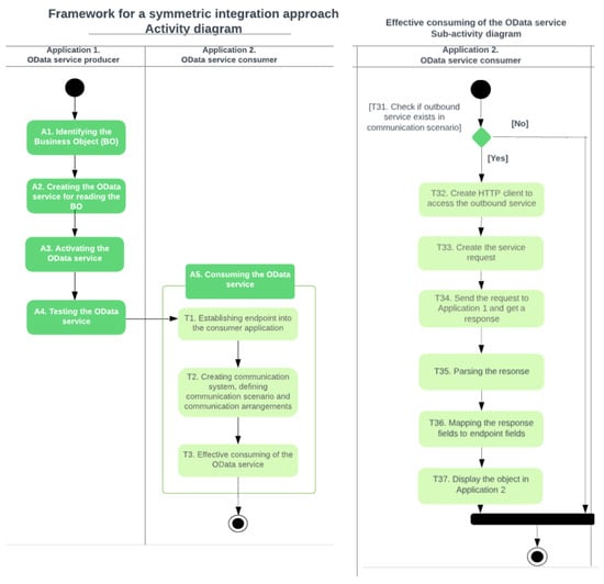 For the consumption of the OData service (activity A5), three tasks are necessary (T1–T3). Furthermore, task T3 was designed as a sequence of seven sub-tasks (Figure 6). After sending the request to Application 1 and getting the service response (sub-task T34), parsing the response (sub-task T35) followed by mapping the response fields to the endpoint fields in Application 2 (T35) is essential to obtain a symmetric integration approach.