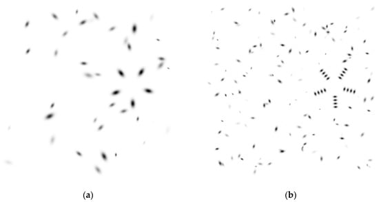 Figure 1 shows my suggestion for synthetic test data. Such images are both, a test image, as well as a heatmap presenting the presence of a primitive object in the inverted convention. The arrangement shown in the Figure follows A. Desolneux’s two-model approach []: the foreground represents the symmetric pattern, the Gestalt, which may be disturbed by small normally distributed displacements; the background is given by uniformly distributed clutter patterns, which are similar to the parts of the foreground aggregate. The atoms of such datum are given in our Gestalt domain [], i.e., they feature a location, a scale, an orientation, and a quality. Their rotational periodicity is always set to two here. They have no other features, such as colors or forms. The datum then is generated as a list of such atoms by random number generation. Additionally, it contains ground truth on the foreground in the form of a Gestalt term, see Reference [].