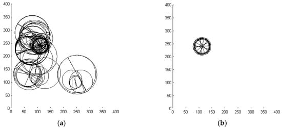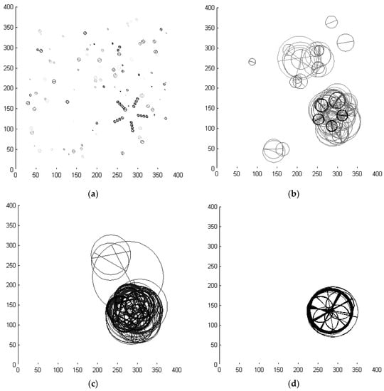 On the other hand, the synthetic samples generated as outlined above in Section 1 usually give close to perfect recognition performance with our method. Figure 2 above shows already that the system will find the correct parts, organization, location, etc. with high reliability. Following again Desolneux’s rationale presented in Reference [], the recognition should be compared to human seeing. The images are shown to several observers asking them to mark salient symmetry. For example, most of them would quickly find the pattern in Figure 2a, which is only masked by moderate clutter, but they would have problems with the cluttered scene given in Figure 2c. The machine has no difficulty with this scene as Figure 3 clearly indicates. The synthetic input data are still required in order to determine the breakdown point of stratified CFAR search, or other non-exhaustive enumeration methods.
