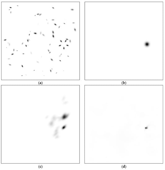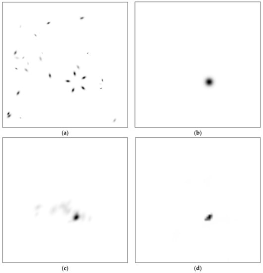 Following Desolneux et al. [] we added adjustable amounts of clutter objects. We choose three steps here as well, namely 25, 40, and 65 objects. Elements occluded by the foreground are suppressed. Figure 5a,b show such datum. We added a thin black frame for better orientation. There are 90 such data, representing three off axis tilt angles × 3 clutter amounts × 10 repetitions with different random setting. The figure presents the first datum, which turns out a complete success for both methods. The resulting heatmaps are displayed in (c) and (d), respectively.