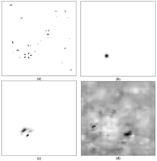 #01 of the evaluation list—tilt angle 10°, 25 clutter elements: (a) input image; (b) ground truth image; (c) result image of sparse method; (d) result image of dense CNN method.