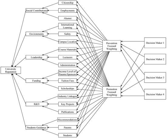 Psychology helps us to understand people’s minds, their motivations, and the way they take decisions. Psychology can be defined as the science that studies human behaviour and mental processes through various research methods and empirical observation [3,4]. The cognitive processes and responses not only imply the actions of people, but also their feelings, memories, perceptions, thoughts, mental processes as well as body functions. Decisions are made either towards having pleasure or avoiding pain, in other words, increasing profit or reducing risk. This observation was crystallized by Higgins [5], who developed the regulatory focus theory (RFT). RFT explains people’s motivation in achieving their goals from two different orientations, which is a promotion and preventive focus. Promotion focus oriented people are individuals who pay more attention to secure the enjoyed pleasures in accomplishing their decision goals rather than the pain that can be caused by their decisions. On the other hand, preventive focus orientated people are those who pay more attention to avoid the inflicted pain in pursuing their decision goals instead of the pleasure that is obtainable as the outcome of their decision. Now, these kinds of individuals make up the university management that drives the university culture through the cumulative decision they make based on their orientations. Also, regardless of the decision criteria, the outcome is tailored by the weights allocated by the decision makers’ (DMs) RFT orientations.