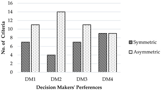 In this paper, the GRFT weighting method was applied to estimate the weights of the criteria in grey numbers. The weights are subjective and were based on the preferences of the DMs. The percentage points given to criteria were based on the level of importance. For the second-level criteria, the DMs were asked their ratings twice. One question was asked from a prevention focus orientation, and the other question was asked from a promotion focus orientation. A rating approach is a form of points allocation method, where points are assigned to the criteria based on the level of importance. For uniformity, we requested the DMs to use a percentage in allocating points to all the criteria. Each DM provided the ratings (scores) using a scale of 0—100 (percentage) for a total of 42 questions, six questions for the first-level criteria and 36 questions for the second-level criteria, as shown in Table 2 and Table 3. For clarity, Figure 2 shows a flowchart of this study. Also, we classified the ratings of the DMs to be symmetric RFT ratings if the assigned ratings for prevention and promotion focus questions for the criteria were equal ; otherwise, the ratings were asymmetric RFT ratings. From Figure 3, at least half of the answers given by the DMs were asymmetric. Thus, it may be erroneous to measure the DMs’ preferences form a single orientation.