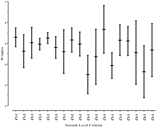 Then, the first-level criterion weights were standardized using Equation (11), [0.1438, 0.1692], [0.1455, 0.1607], [0.1438, 0.1692], [0.1184, 0.1692], [0.1269, 0.1624], [0.1184, 0.1692], see Table 5 as well. Also, the second-level criteria were standardized using Equation (12).