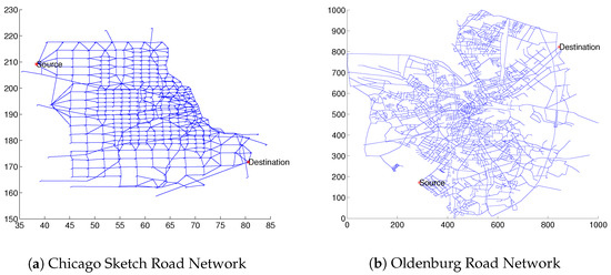 We first used the Chicago sketch road network as shown in Figure 5a for its similarity with the grid network. The results are shown in Table 4. It can be observed that the density of real networks is smaller than that of the regular grid network. Hence, the basic SSPIT-D algorithm is much easier to solve on real networks. As we mentioned above, the better-response procedure which uses a local-search procedure becomes time-consuming as the number of nodes N grows. Recall that the complexity of the better-response procedure is . However, the subgraph-enhanced algorithm SSPIT-S performs better than the other three, which significantly improves the efficiency of the decomposition approach, especially for the case of large increments.