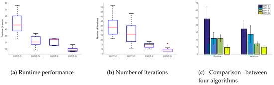 Figure 6c compares the four decomposition algorithms from the runtime and the number of iterations. The first set of data for Figure 6c compares the average runtime of the four algorithms. Here, the baseline SSPIT-D took 48.3 seconds; SSPIT-DL decreased the runtime to 21.5, while SSPIT-S decreased the runtime to 21.8. The combination of two enhancements SSPIT-SL further reduced runtime to 9.2. Similarly, the second set of data for Figure 6c compares the average number of iterations. Here, the baseline SSPIT-D took 35 iterations; SSPIT-D decreased the iterations to 27, while SSPIT-S decreased the iterations to 14. SSPIT-SL had the smallest number of iterations of 10. These results show that both the subgraph procedure and the better-response procedure can effectively reduce the runtime and number of iterations. For both procedures, the subgraph procedure is more effective at reducing the number of iterations, while the better-response procedure’s data variance is significantly larger, which implies that SSPIT-DL is more unstable. The combination of the two provides a boost in performance, which makes SSPIT-SL even more effective.