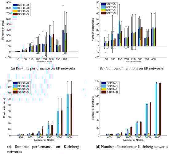 Figure 7a,b presents the results of ER random networks of different sizes varying the number of nodes with arc connection probability of 0.5 (Random ER network: , N is the number of nodes). These results show that all four decomposition algorithms performed well in scalability for the ER network. As the size of the ER network expands, the three enhanced algorithms gradually outperform the basic SSPIT-D algorithm, in which the performance of SSPIT-S is better. In terms of iterations, the average number of iteration of the two algorithms related to the better-response procedure, i.e., SSPIT-DL and SSPIT-SL, is higher than those of the remaining two, which implies that the better-response procedure is not suitable for the ER network model. Thus, the experiment result shows that the subgraph procedure enhanced algorithm SSPIT-S provides the most improvement.