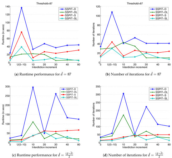 For a fixed threshold , as the value of increases, the runtime of the case of reaches the peak. According to Figure 8a,b, SSPIT-D and SSPIT-S are more susceptible to the value of in the case of a small threshold. This indicates that the better-response algorithm based on a local-search procedure is more robust against the interdiction increment . In the case where , the enhanced three algorithms still outperform the basic algorithm SSPIT-D. As the value of increases, SSPIT-DL and SSPIT-SL are more robust. Hence, the better = response procedure can effectively deal with large interdiction increments, and together with the subgraph procedure, it can further improve the robustness of the decomposition algorithms.