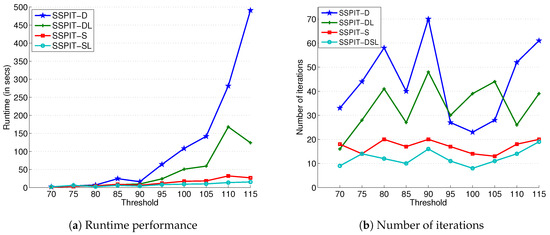 Using the same grid network described above, we also tested the four decomposition based algorithms under different goal thresholds. Figure 9 presents the results when varying the value of threshold. Figure 9a,b depict the trends in the runtime and number of iterations as the threshold increases, respectively.