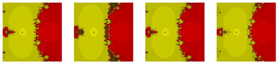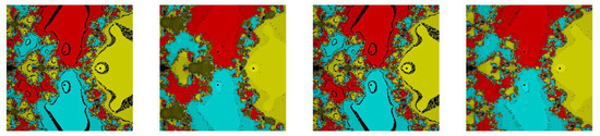From Figure 1 and Figure 2, we conclude that our methods, namely, and , are showing less chaotic behavior and have less non-convergent points as compared to the existing methods, namely and . In addition, our methods, namely, and , have almost similar basins of attraction to . On the other hand, Figure 3 and Figure 4 confirm that our methods, namely, and , have less divergent points as compared to the existing methods, namely and . There is no doubt that the behavior is better than all other mentioned methods, namely, and in problem in terms of chaos.