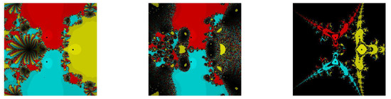 Different colors are used for different roots. In the basins of attraction, the number of iterations needed to achieve the root is shown by the brightness. Brighter color means less iteration steps. Note that black color denotes lack of convergence to any of the roots. This happens, in particular, when the method converges to a fixed point that is not a root or if it ends in a periodic cycle or at infinity. Actually and although we have not done it in this paper, infinity can be considered an ordinary point if we consider the Riemann sphere instead of the complex plane. In this case, we can assign a new “ordinary color” for the basin of attraction of infinity. Details for this idea can be found in [30].