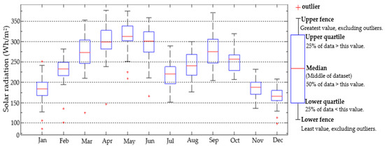 The highest average solar radiation of 338.7 Wh/m2 is observed in May; the lower adjacent is 251.1 Wh/m2 and the upper adjacent is 377 Wh/m2. The red cross represents outliers, which mostly belonged to the lower adjacent. Thus, these outliers should not be considered to reduce their effect on the collected data. The two lower outliers were 209.2 and 224.8 Wh/m2, which occurred in May 1990 and 1981, respectively. The lowest average solar radiation, 166.1 Wh/m2, was observed in December. The lower adjacent was 129 Wh/m2 in December 1992, and the upper adjacent was 207.7 Wh/m2 in December 1985. The two lower outliers, 98.3 Wh/m2 and 113.4 Wh/m2, occurred in December 1990 and 1991, respectively. The largest variation in solar radiation was observed in September, which may be attributed to seasonal weather fluctuations in this month of the year.