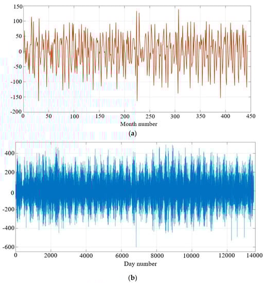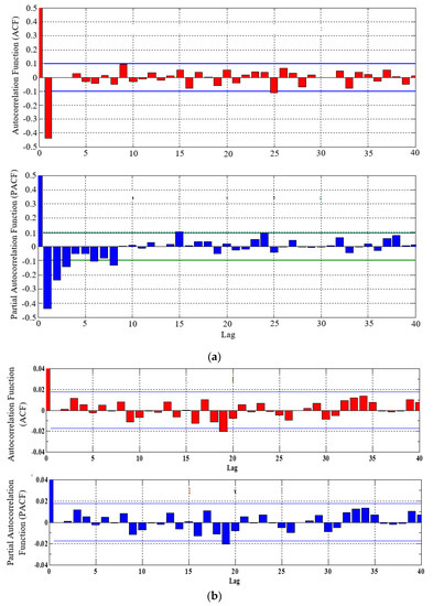 Stationary time series data are prerequisite for developing and testing an ARIMA model [38]. Therefore, the collected data were processed, and the first difference was applied to stationarize data. A Phillips–Perron test was performed to determine the first difference stationary of the data by using a Matlab code (pptest). This test can assess the null hypothesis of a unit root in a univariate time series yt. Here, all tests use the model yt = c + δt + a yt − 1 + e(t). The null hypothesis restricts a to equal 1. The variants of the test, which are appropriate for series with different growth characteristics, restrict the drift and deterministic trend coefficients (i.e., c and δ, respectively) to 0. The tests use the modified Dickey–Fuller statistics to account for serial correlations in the innovations process e(t) [39]. The Phillips–Perron test result of h = 1 indicates that the first difference can sufficiently stationarize the monthly and daily solar radiation data. Furthermore, Figure 3 shows the stationary time series data for both daily and monthly solar radiation after the first difference was applied. The data clearly fluctuate around zero; thus, they may be considered stationarized. This finding indicates that the first difference is sufficient and further data treatments are unnecessary.