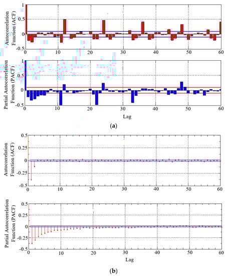 ARIMA is based on two parts: an auto-regressive (AR) part and a moving average (MA) part. Also, this model is usually referred to as ARIMA (p, d, q). In this, p and q are the order of AR and MA respectively; where d is the difference order [40,41]. They indicate the possible ARIMA (p, 1, q) model, where, usually, p = 1–5, q = 1–3, and d is usually 1 [42]. ARIMA model identification was done by considering the ACF and PACF for the stationary time series data. The results of the ACF and PACF tests for daily and monthly solar radiation are shown in Figure 4. The ACF and PACF were tested for 60 lags to investigate the seasonality action.