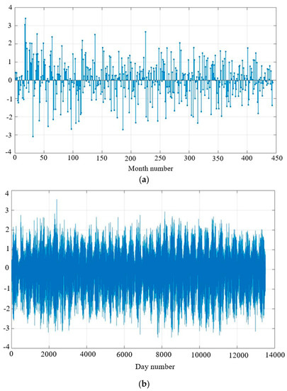 Standardized residuals for monthly and daily solar radiation. (a) Month; (b) Daily.