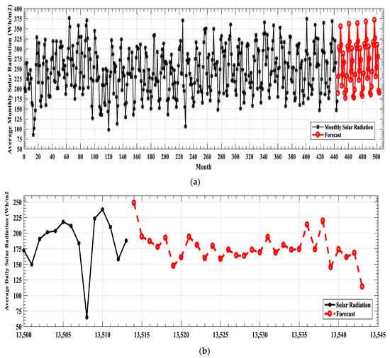 Long-term forecasting for lead times of 10 years and 1 month were conducted using the best models with historical data of average monthly and average daily solar radiation. Figure 7a presents the expected monthly solar radiation for the next 10 years (120 months). The expected average monthly solar radiation values were within the range of 176–377 Wh/m2. The general fluctuation trend was maintained, which can be explained by variations in solar radiation due to changes in weather conditions throughout the year. The general trend of monthly solar radiation increased with time, as shown in Figure 7, which may be expected due to increasing UV radiation levels as a result of climate change and ozone layer depletion [45]. The expected monthly solar radiation is expected to reach 377 Wh/m2. Figure 7b shows the expected average daily radiation for a month in advance. The fluctuation is existing for real average daily radiation, and this fluctuation is kept with the forecasted values. The fluctuations for forecasted average daily radiation seemed larger in comparison with real inputs or forecasted monthly solar radiation.
