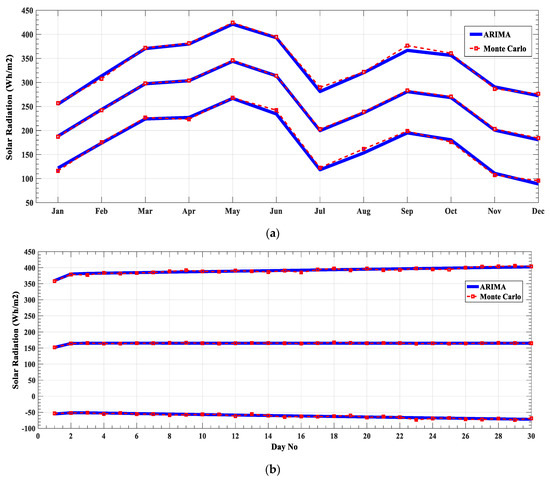 Finally, comparisons of the ARIMA model with Monte Carlo simulations of monthly and daily solar radiation for the next year and next month are shown in Figure 8. Although the Monte Carlo simulation presents relatively larger fluctuations, the means of this model and the ARIMA model are virtually indistinguishable. The upper on lower lines in Figure 8a,b represent 95% confidence intervals. Slight discrepancies were observed between the theoretical 95% forecast intervals and the simulation-based 95% forecast intervals. As in the real measured data, May showed the highest solar radiation with an average value of about 346.2 Wh/m2. The lowest monthly solar radiation was expected in December (184.3Wh/m2), which represents the lowest month of solar radiation in actual readings. However, the general trend of monthly solar radiation increased with time. For instance, an increase in average solar radiation of about 2.5% was recorded in May, while the increment in average solar radiation for December is about 10%.