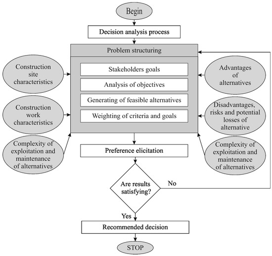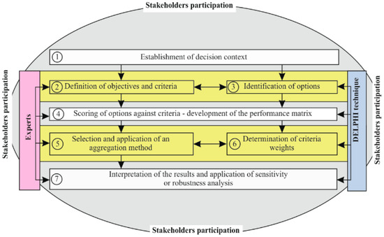 It is worth noting that besides the methodological developments, there are a large number of successful applications of MCDM methods to real-world problems that have made MCDM a domain of great interest, both for academics and for industry practitioners [43]. The increasing complexity of the rapidly evolving business, engineering, science, and technology environments entails making the right decisions when considering environmental, market and economic considerations. The stages of a typical MCDM procedure in civil engineering are shown in Figure 1. Often, different MCDM techniques do not lead to the same results. Multi-criteria utility models are models designed to obtain the utility of items or alternatives that can be evaluated on more than one criterion.