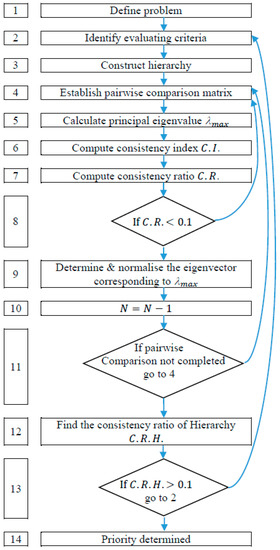 The review of past works shows that AHP is the most common MCDM method used to solve civil engineering multi-attribute decision-making problems. The oldest reference dates from 1972 [58]). Later, Saaty [56] described the technique. An analysis process using the AHP is shown in Figure 4. The AHP modeling process is based on four principles: structuring the decision problem, measurement technique (the impact of the elements of the hierarchy is assessed through paired comparisons done separately in reference to each of the aspects of the level immediately above), data collection, determination of normalized weights, and synthesizing to find a solution to the problem [59].