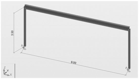 The authors investigated a real case study as an object for multi-criteria assessment. The dimensions of the building are 78 × 9 × 3.5 (h) m. A structure consists of 14 transverse frames 9 × 3.5 (h) m (see Figure 5) set in step 6 meters. There are three identical buildings at the site. Therefore, 42 frames are needed.