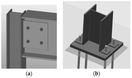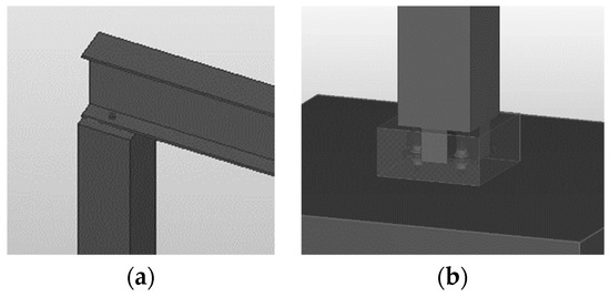 Case 5. In this case, the elements of the frame were made from different materials. The columns were designed as precast RC elements. The beams are made of steel. The columns on the foundations had fixed rigidity. The beam on the columns was connected as pinned. The columns were designed by a 250 × 250 mm square cross-section. Beam cross-section of the IPE360 profile. The joints of the frame are shown in Figure 10.