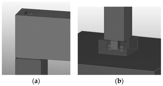 Case 4. In this case, the frame was made from precast concrete beam and columns. The columns on the foundations had fixed rigidity. The beam to the columns was connected as pinned. The columns were designed from 250 × 250 mm squares and beams from 250 × 400 (h) rectangular cross-sections. The joints of the frame are shown in Figure 9.